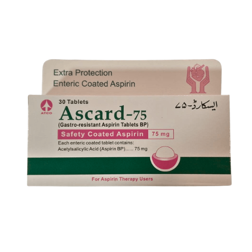 Ascard 75mg Tablet is a low-dose aspirin medicine used to help prevent the formation of harmful blood clots. It is commonly prescribed to reduce the risk of heart attack, stroke, and other cardiovascular complications in high-risk patients. This medicine works by improving blood flow and reducing platelet aggregation.